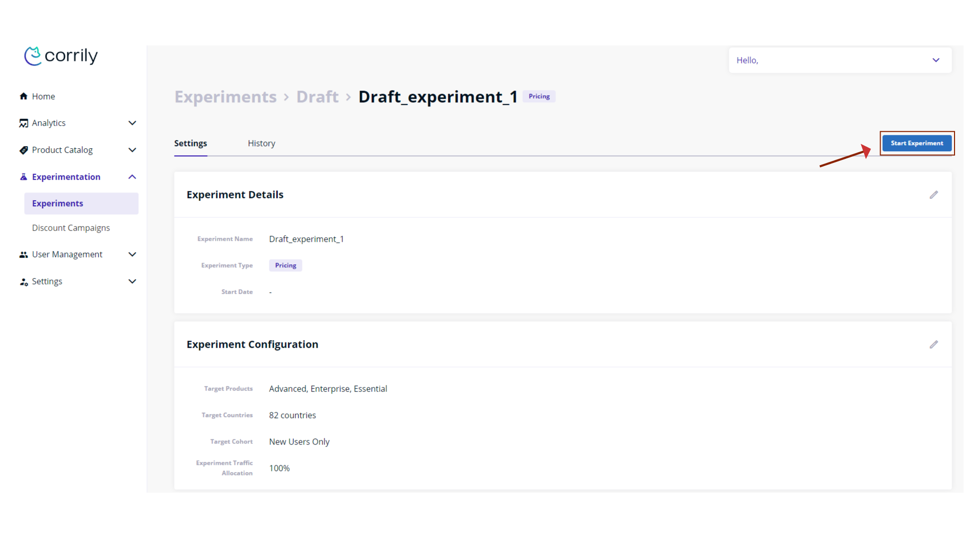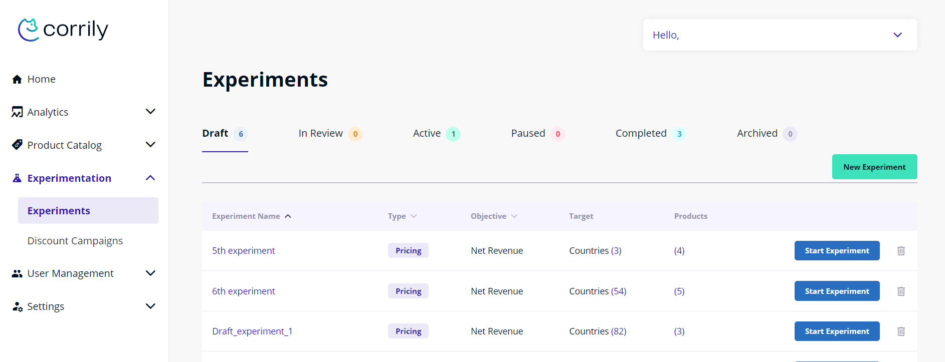 Before running an experiment, it is important to outline what hypothesis you want to test. This could mean running a single experiment or it could mean breaking down the hypothesis into multiple experiments. For e.g. if your hypothesis is that there may be higher willingness to pay for your products in North America, you may want to break down the hypothesis into two experiments - one experiment across US and Canada (since they are likely similar markets for your business), and another for Mexico. If your hypothesis is a little more specific - say, there is higher willingness to pay amongst professionals in North America, it is best to define the relevant audience on the Corrily dashboard, and segment your experiment further. However, if you do not have a strong hypothesis, we recommend starting broad, learning from the experiment analytics so you can form some hypothesis, and then running more specific experiments. Other important consideration when designing your experiment is to think through what cohorts of users do you want to experiment on. Do you want to experiment solely on new users who have never seen your pricing page before, or you want to experiment with just the free user base. There are all important considerations in deciding who to experiment on and setting your experiments up for success.Corrily’s pricing experts are always available to help you think through these trade-offs
