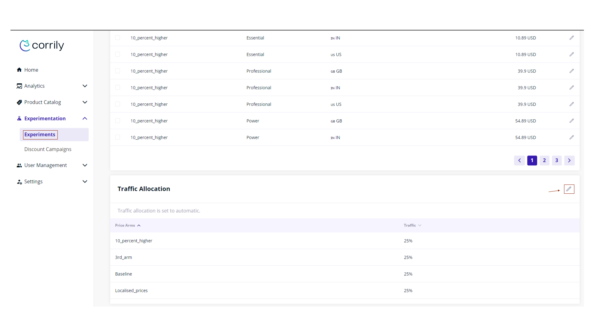 0%. This enables manual testing without affecting production users. - With Corrily API, you can force experimental prices to be returned even when traffic is set at
