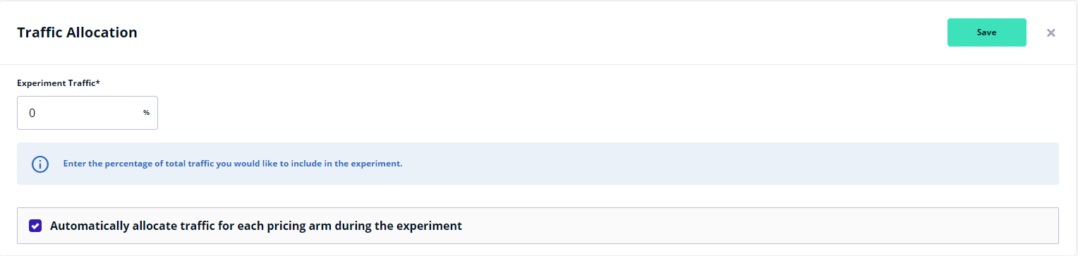 0%in this instance). Options are available for either automatic traffic allocation per experiment arm or manual adjustments. Confirm your settings by clicking “Save.”