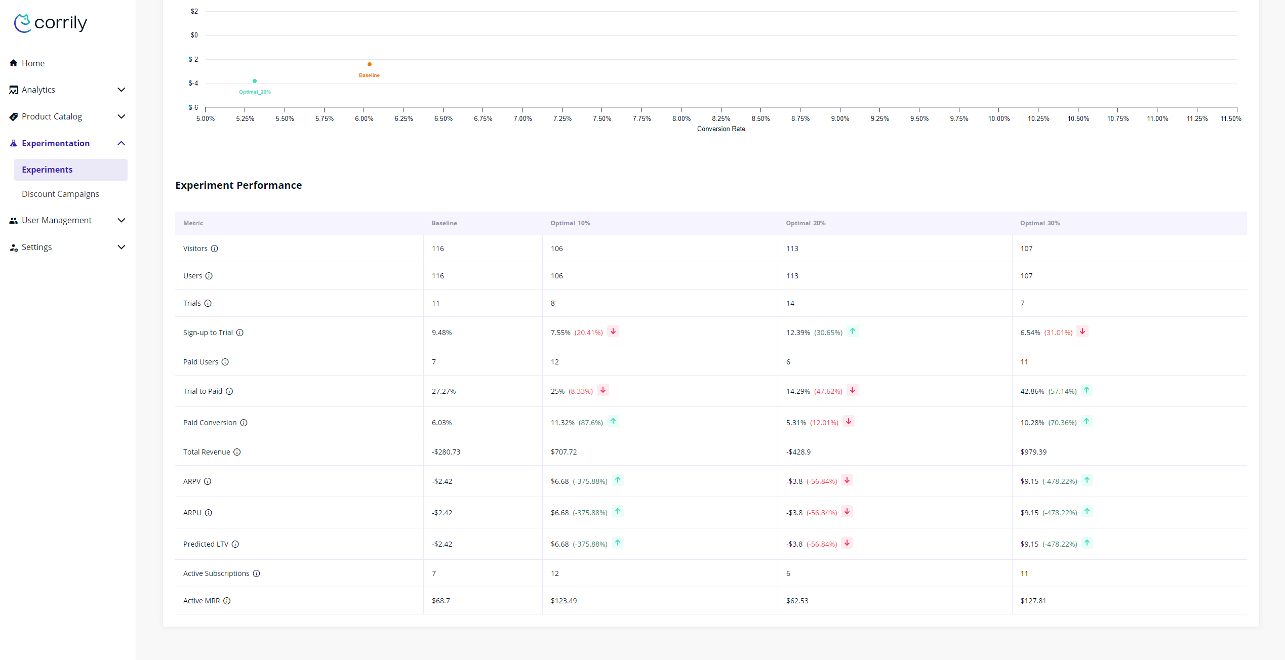 Corrily provides the comprehensive set of charts to study the experimental prices performance on every stage of the user funnel:- starting from conversion from free Visitors to the signed Users,