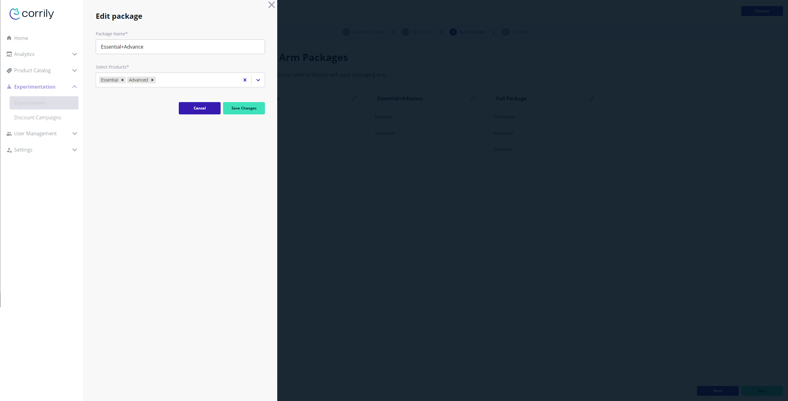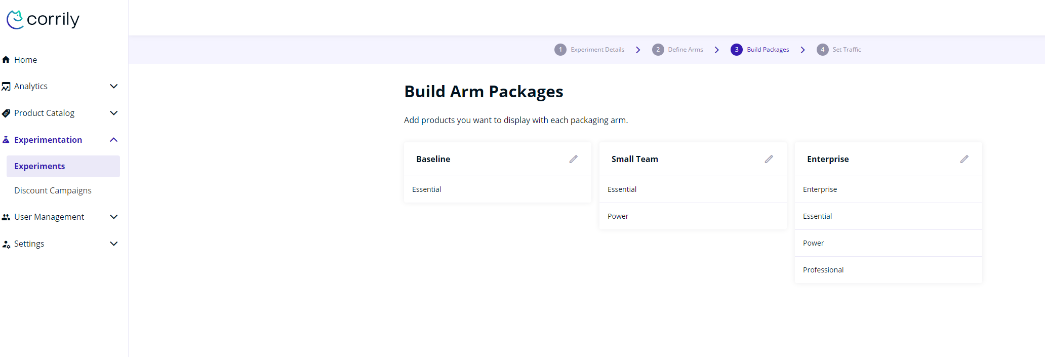 Corrily’s packaging experiments allow you to test various packaging strategies for your entire user base or a subset of users to find out, what combination of products and plans work best for them. You can use a packaging experiment to test:- Different combination of plans for e.g. say you have 4 tiers of your product offering -