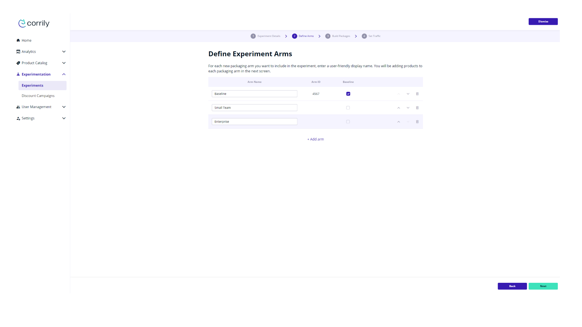 Corrily experiments utilize the concept of arms. Think about it as about “AB tests on steroids”. Experiment will have a couple of arms to test, which should include the single baseline arm to compare with. For any arm except baseline you would need to set the products you want in that specific package. could be done in the Experiment Setup Interface, similar to Price Control Center. In our example, we are starting a new experiment, and after filling the first page of information related to the experiment we reach the Define Arms step. Here we have a Baseline arm and we need to add at least one more to be able to proceed. Note that if you wish to delete the Baseline arm you can do that but you need to set another added arm as the new Baseline.