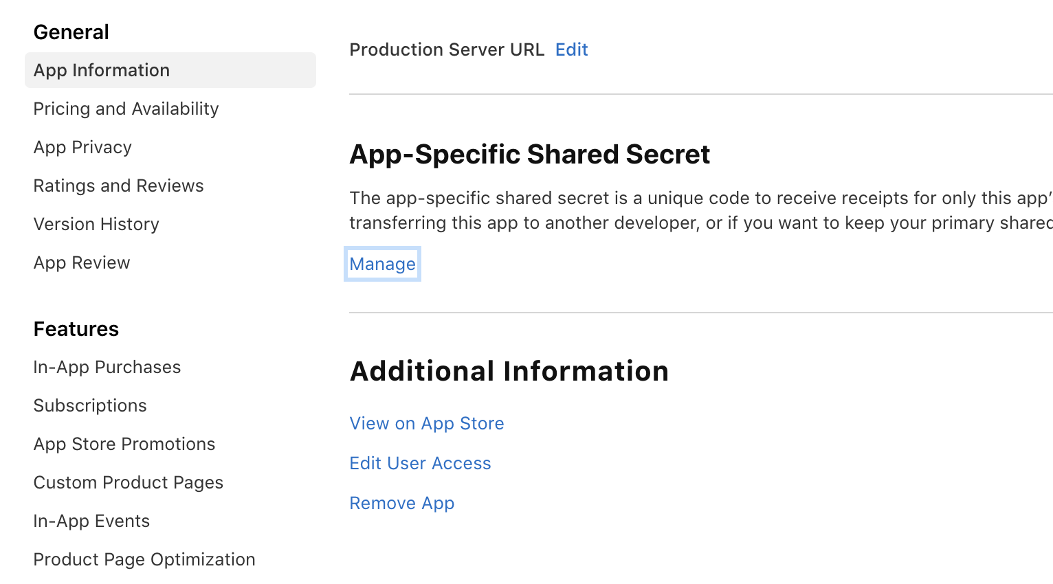 - Select “Manage” under the App-Specific Share Secret section from the right side