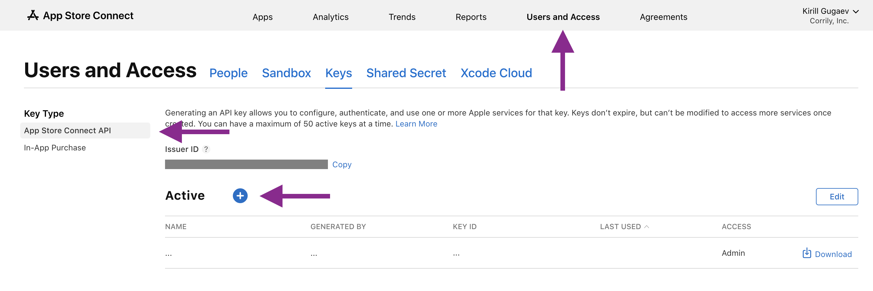 - Once everything is set up in App Store Connect, you need to upload the App Store Connect API key from the previous step to Corrily.