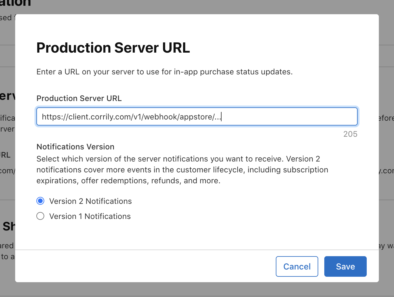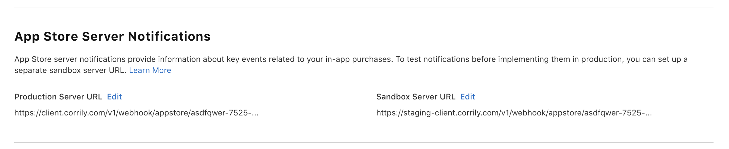 Setup Apple server-to-server notifications with the URL provicded in Corrily Dashboard:- Navigate to the App Store Integration settings in Corrily Dashboard > Integrations.