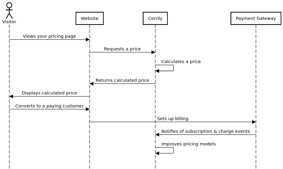 - Improves pricing models. Corrily uses the webhook events (or absence of webhook events) as signals for determining optimal prices. A “new customer” event is a signal that the price was close to optimal. An “invoice paid” event is a further signal. 6 “invoice paid” events is even more of a strengthening signal. Many “subscription cancel” events in a short timeframe could be a signal that something has changed (e.g. a particular country is going through an economic recession) and therefore the optimal price is now probably lower.